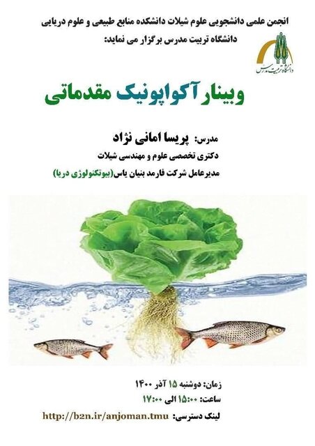 این برنامه با ارائه پریسا امانینژاد ـ دکترای تخصصی علوم و مهندسی شیلات، روز دوشنبه ۱۵ آذر، ساعت ۱۵ الی ۱۷، به صورت آنلاین برگزار میشود.