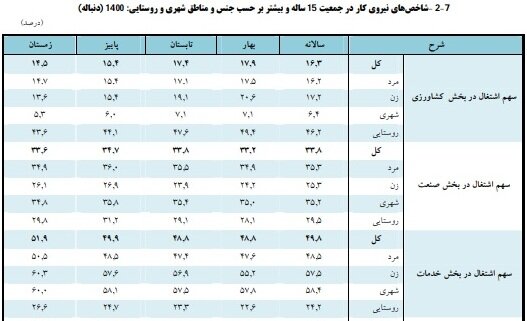 به موجب این گزارش، سهم اشتغال بخش خدمات در بهار و تابستان سال گذشته ۴۸.۸ درصد بوده در حالی که در پاییز ۱۴۰۰ به ۴۹.۹ درصد رسیده و در فصل زمستان به ۵۱.۹ درصد افزایش یافته که نشان از رشد تعداد شاغلین و سهم اشتغال این بخش دارد، این در حالی است که سهم اشتغال بخش کشاورزی در فصول بهار و تابستان به ترتیب ۱۷.۹ و ۱۷.۴ درصد بوده و در پاییز و زمستان به ۱۵.۴ و ۱۴.۵ درصد کاهش یافته است که ناپایداری شرایط جوی و ‌آب و هوایی،کاهش نزولات آسمانی، خشکسالی‌ و کاهش فعالیتهای کشاورزی در فصول سرد سال در این امر بی تاثیر نبوده است.