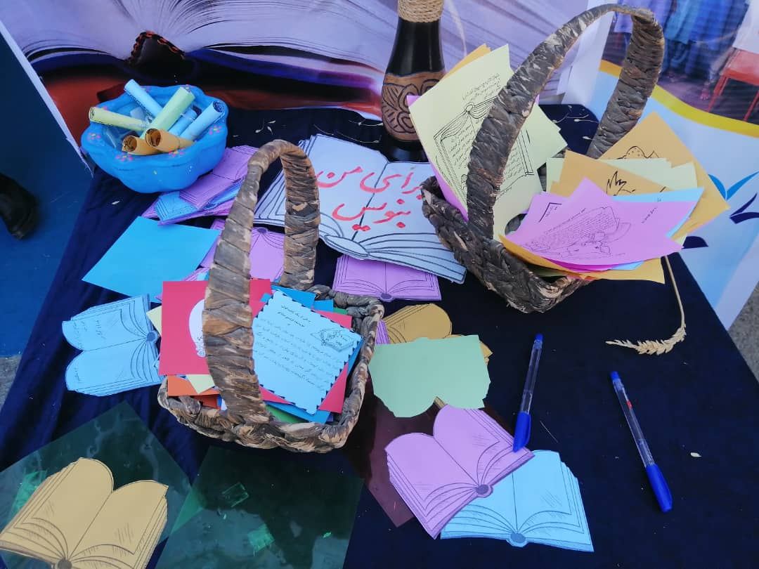 چند سبد با کاغذهای رنگارنگ در مقابل غرفهای توجهم را جلب میکند، سمت سبدها میروم تا ببینم چه چیزی در آنهاست. ناگهان سبد در مقابلم قرار میگیرد که "صبحتان را با حافظ شروع کنید." پس در آن کاغذها شعر حافظ است. بلافاصله سبد دیگری به سمتم تعارف میشود "بچهها کتاب معرفی کردهاند، بردارید. در آن یکی هم برش کتاب است." همین باعث میشود وارد غرفهشان شوم. خود را هانیه ابویسانی از روستای ابویسانِ شهرستان جغتای استان خراسان رضوی معرفی میکند. چند سوال کوتاه بینمان رد و بدل میشود و با علاقه و ذوقی که در چشمانش میتوان دید از بچههای روستایشان میگوید.