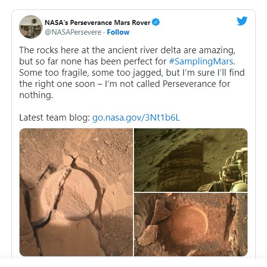 تیم هدایت کننده این مریخ نورد به تازگی در توییتی از زبان مریخ‌نورد استقامت نوشتند: سنگ‌های دلتای رودخانه باستانی شگفت‌انگیز هستند، اما تاکنون هیچ‌یک برای نمونه‌برداری از مریخ مناسب نبوده‌اند. بعضی خیلی شکننده و برخی بیش از حد ناهموار هستند، اما من مطمئنم که به زودی مورد مناسب را پیدا خواهم کرد. بی‌دلیل که اسمم را "استقامت" نگذاشته‌اند.