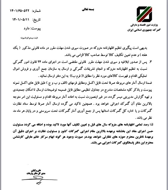 طبق اعلام صورت گرفته، اگر گمرکی در پایان هر ماه گزارش مورد نظر را ارائه ندهد به منزله عدم وجود کالای متروکه و اقدامات مقتضی مطابق مقررات تلقی شده و مسئولیت آن با بالاترین مقام آن گمرک خواهد بود.