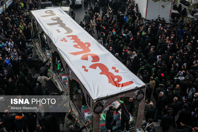 مردم یک به یک به تابوت‌ها نزدیک می‌شوند بر آنها دست می‌کشند پارچه‌ای تبریک می‌کنند و لحظاتی سر بر تابوت شهید اشک می‌ریزند. تصاویر حاج‌قاسم در دستان مردم و رو به دوربین‌های اطراف مسیر ‌بالا گرفته می‌شوند.