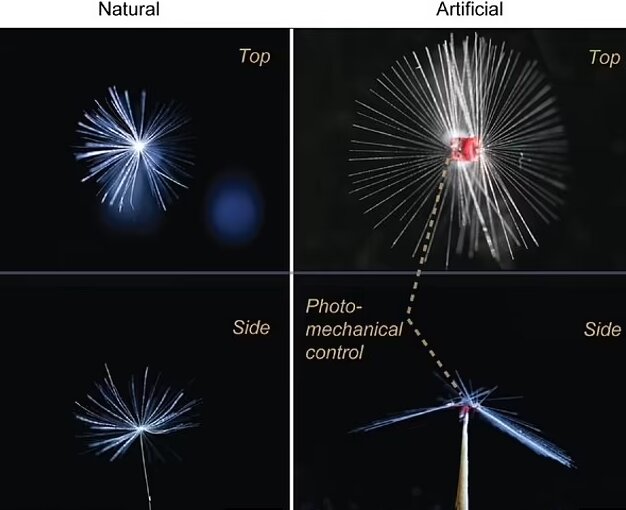 مهندسان در این پژوهش، برای ساخت یک ربات پرنده جدید، از نوعی قاصدک الهام گرفتند. ظاهر این ربات شبیه به دانه قاصدک است. ربات، مویچههای بسیار ظریفی دارد که از دو بال بیرون میزنند و وقتی با نور فعال شوند، به آرامی تکان میخورند. هنگامی که نور به ربات تابیده میشود، باز شدن یا تا شدن بالهای آن را به همراه دارد. از این ویژگی میتوان برای کنترل برخاستن و فرود ربات استفاده کرد.