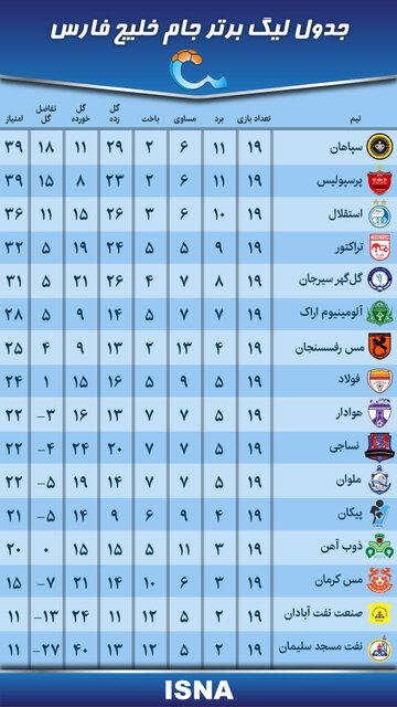 جدول رده بندی لیگ برتر فوتبال در پایان هفته نوزدهم به شرح زیر است:
