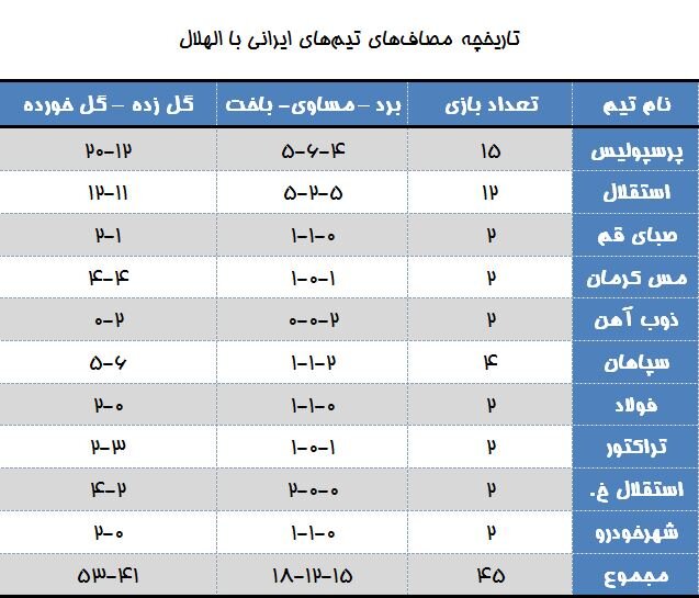 تاریخچه مصافهای تیمهای ایرانی با الهلال به این شرح است: