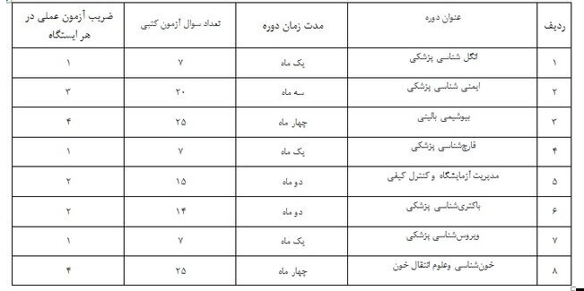 دروس و ضرایب آزمون پایانی کتبی و عملی دوره تکمیلی تخصصی علوم‌آزمایشگاهی در جدول زیر آمده است: