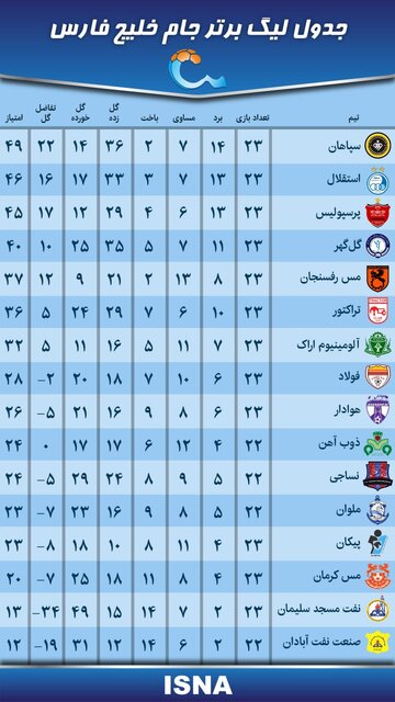 جدول لیگ برتر پیش از برگزاری دو بازی باقی مانده از هفته بیستوسوم به صورت زیر است: