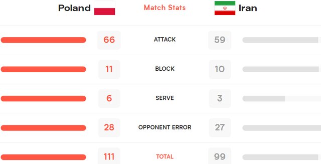 در این بازی، تیم والیبال لهستان در حمله برتر بود و ۶۶ امتیاز از طریق حمله برای تیم خود کسب کرد. این درحالی بود که ایران ۵۹ امتیاز از حمله به دست آورد. حمله موفق لهستان نقطه قوت این تیم و یکی از دلایل اصلی پیروزی مقابل ایران بود چرا که در سایر آیتمها اختلاف زیادی بین دو تیم وجود ندارد.
