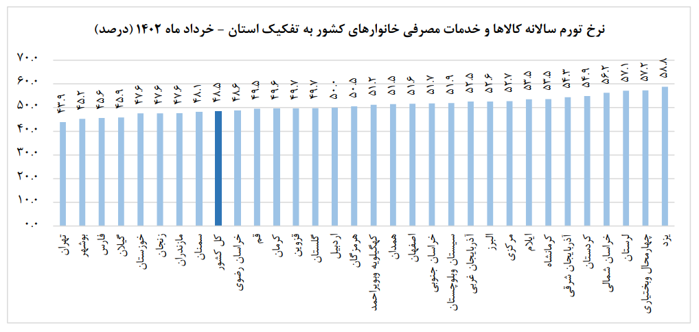 درخرداد ماه ١٤٠٢، نرخ تورم سالانه برای خانوارهای کشور به ٤٨,٥ درصد رسیده که نسبت به همین اطلاع درماه قبل، ٠,٦ واحد درصد کاهش یافته است.