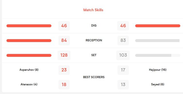 این بازی در پنج ست و به ترتیب با نتایج ۲۵ بر ۲۱، ۲۱ بر ۲۵، ۲۵ بر ۲۲، ۲۲ بر ۲۵ و ۱۱ بر ۱۵ به سود والیبال بلغارستان پایان یافت.