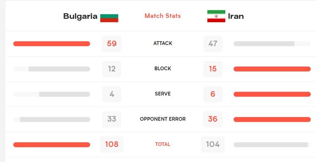 در این بازی تیم ملی والیبال بلغارستان ۵۹ امتیاز از حمله به دست آورد درحالی که تیم ملی والیبال ایران در این بخش تنها ۴۷ امتیاز کسب کرد تا کسب امتیاز در حمله پاشنه آشیل ایران در این بازی باشد.
