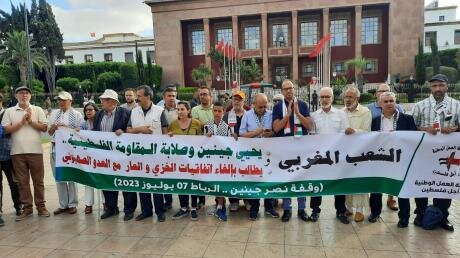 در این تجمع که با حضور تعدادی از فعالان حقوق بشر، نمایندگان نهادهای حامی مساله فلسطین و رهبران سندیکاهای «اتحادیه ملی مشاغل مراکش» و «کنفدراسیون دموکراتیک کار» برگزار شد، شرکت کنندگان علاوه بر پرچم فلسطین پلاکاردهایی با محتوای حمایت از جنین و صلابت مقاومت و نیز لغو قراردادهای ننگین و شرمآور با رژیم صهیونیستی در دست داشتند.