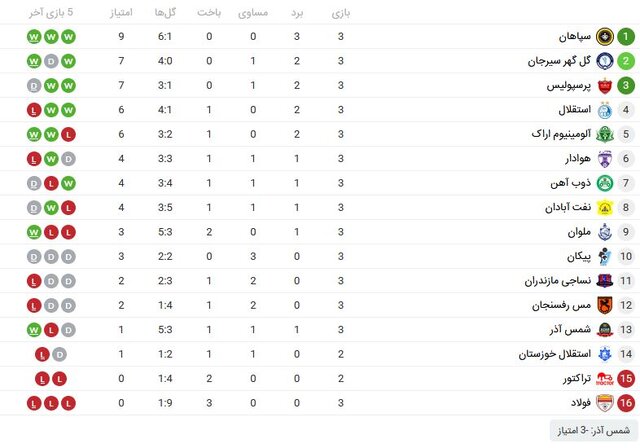 جدول لیگ برتر تا پایان هفته سوم به صورت زیر است: