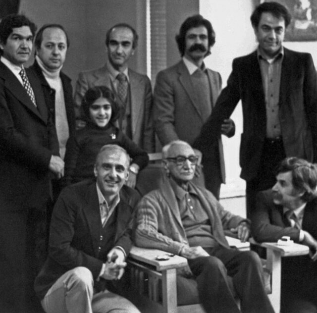 ایستاده از راست: مرتضی ممیز-هوشنگ منصوری برکشلو- لطیف ابوالقاسمی و دخترش- محمد احصائی- مهندس منوچهر طبیبیان