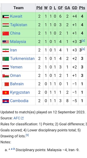 خبر تکمیلی: با پایان یافتن تمام دیدارها ایران در جدول تیمهای دوم، بعد از کویت، تاجیکستان و چین، از لحاظ امتیاز و تفاضل و گلزده با مالزی برابر شد اما به دلیل دریافت کارت زردهای بیشتر نسبت به این تیم، در رده پنجم قرار گرفت و حذف شد.
