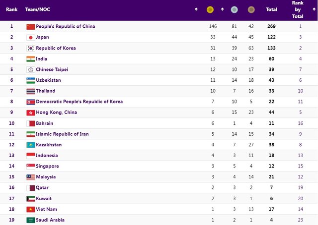 کاروان ایران با ۵ مدال طلا، ۱۴ نقره و ۱۵ برنز و مجموع ۳۴ مدال در رده یازدهم قرار دارد.