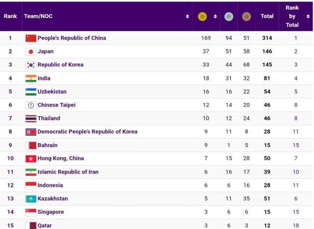 جدول مدالی در یازدهمین روز از بازیهای آسیایی آخرین به روز رسانی ساعت ۱۶:۳۰: