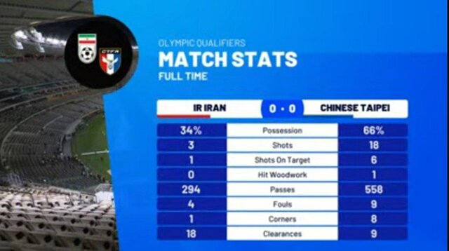 آمار مالکیت توپ در این بازی ۶۶ به ۳۴ به سود چین تایپه بود. تایپه نیز ۵۵۸ پاس در مقابل ۲۹۴ پاس ایران داشت. در آمار شوت به دروازه نیز ۱۸ به ۳ به سود تایپه بود.