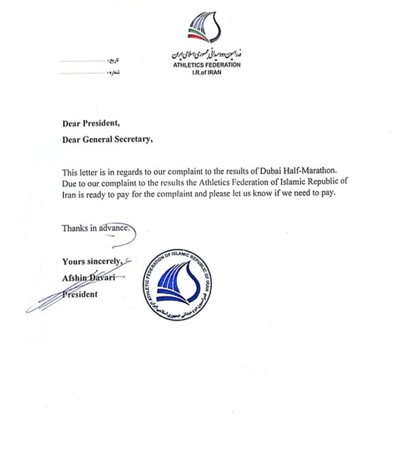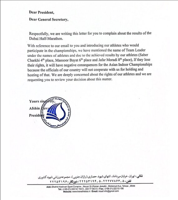 در ادامه تصویر نامه‌های شکایت فدراسیون دوومیدانی ایرانخطاب به دبیر کل آسیا آمده است: