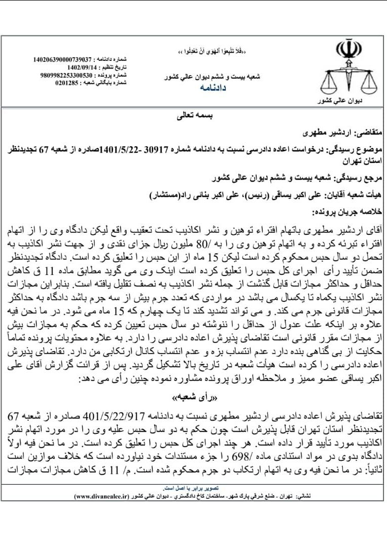 به گزارش ایسنا، شعبه ۲۶ دیوانعالی کشور اعلام کرده است که رأی صادره در شعبه ۶۷ دادگاه تجدیدنظر استان تهران مبنی بر محکومیت اردشیر مطهری نماینده گرمسار در مجلس شورای اسلامی به دوسال حبس تعلیقی در موضوع «کانال تلگرامی حسابکشی» به لحاظ موازین و مقررات قانونی نادرست بوده و آن را بر اساس بند چ ماده ۴۷۴ قانون آیین دادرسی کیفری نقض کرده است.