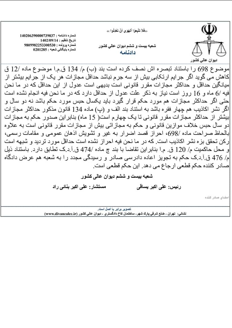 تصویر رای دیوان عالی کشور در این باره را مشاهده میکنید: