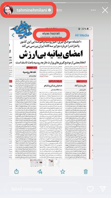 تهمینه میلانی در حالی اقدام به انتشار یک استوری از روزنامه اعتماد کرده که با گافی عجیب مشخص شده، این تصویر از سوی الیاس حضرتی، مدیرمسئول روزنامه برای میلانی ارسال و احتمالا از او درخواست کرده که نسبت به بازنشر و جریان سازی پیرامون آن اقدام نماید!