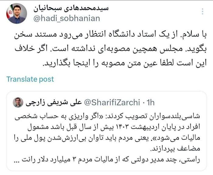 به گزارش ایسنا، در حالیکه چند ساعت قبل خبری در فضای مجازی درخصوص مصوبه جدید مجلس حول نحوه محاسبه مالیات در سال ۱۴۰۳ منتشر شده‌ بود، هادی سبحانیان، رئیس سازمان امور مالیاتی کشور در شبکه ایکس این خبر را تکذیب کرد و در واکنش به توئیت علی شریفی زارچی، استاد دانشگاه خواست تا «عین متن مصوبه» را منتشر کنند.