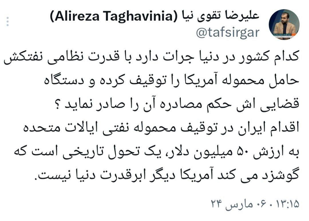 کدام کشور در دنیا جرات دارد با قدرت نظامی نفتکش حامل محموله آمریکا را توقیف کرده و دستگاه قضایی اش حکم مصادره آن را صادر نماید ؟ اقدام ایران در توقیف محموله نفتی ایالات متحده به ارزش ۵۰ میلیون دلار، یک تحول تاریخی است که گوشزد می کند آمریکا دیگر ابرقدرت دنیا نیست.