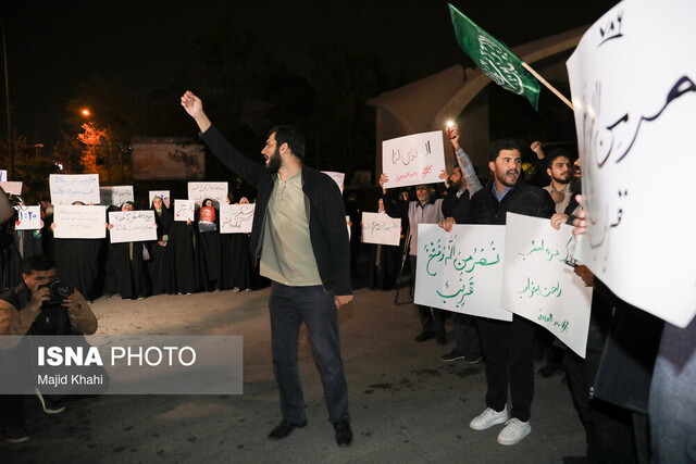 افراد حاضر در این تجمع همچنین پلاکاردهایی در دست داشتند که روی آنها عباراتی از جمله «اسرائیل مرگت مبارک»، «نصر من الله و فتح قریب»، «مرگ بر اسقاطیل»، «القدس لنا»، «#وعدالصادق» نوشته شده بود.