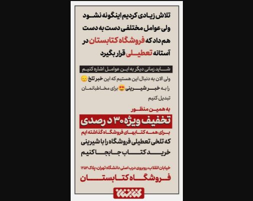 به همین منظور خواستیم که تلخی تعطیلی را به شیرینی تخفیف برای مخاطبان تبدیل کنیم و قرار گذاشتیم که همه کتاب‌های فروشگاه را با ۳۰ درصد تخفیف ارائه کنیم. کتاب‌هایی که از بهترین ناشران ایرانی گردآوری شده است.