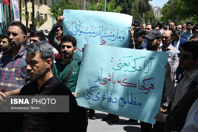 «وجدان ما بیدار است از اسرائیل بیزار است، مثلث شوم و پلید و ابلیس، آمریکا و اسرائیل و انگلیس، مرگ بر اسرائیل و مرگ بر آمریکا» از دیگر شعارها بود و دانشجویان، حمایت خود را از دانشجویان آزادی خواه آمریکا و اروپا اعلام کرده و برخورد خشن پلیس با اعتراض این دانشجویان را محکوم کردند.