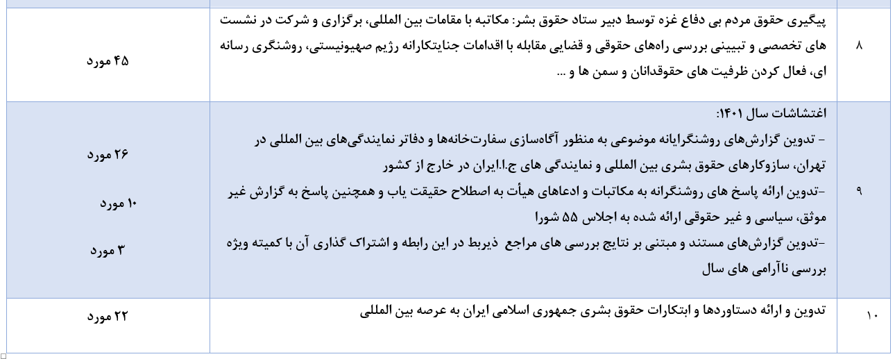 -برنامه ریزی تعامل منطقی و هدفمند با دفتر کمیسر عالی حقوق بشر و انجام بازدید معاون کمیسرعالی و هیأت همراه از جمهوری اسلامی ایران از تاریخ ۱۴ تا ۱۶ بهمن ۱۴۰۲