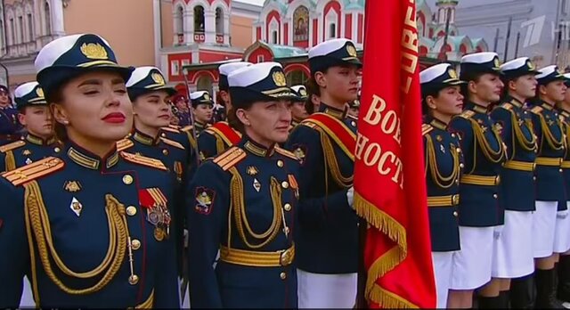 خبرگزاری اسپوتنیک گزارش داد، «رژه پیروزی» با حضور گارد افتخار آغاز شد که پرچم ملی روسیه و پرچم پیروزی شوروی را با صدای آهنگ «جنگ مقدس» به میدان آورده بود.