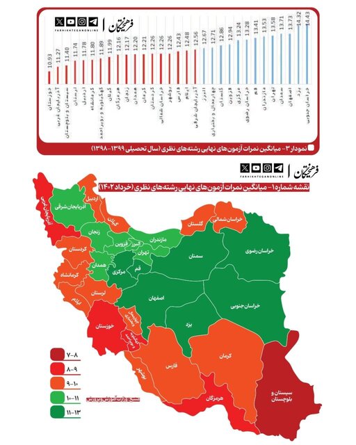 می‌توان گفت نمونه‌ای که ما داریم دانش‌آموزهایی هستند که به پایه دوازدهم رسیده‌اند به سمت بالا تورش یا اریبی دارد، یعنی دانش‌آموزان ضعیف‌تر سال‌ها قبل از سیستم آموزشی خارج شدند. این میانگین نشان‌دهنده این است که چقدر کیفیت آموزشی در کشور ما در سطح نازلی قرار دارد. آن خروجی آموزش‌وپرورش، یعنی خروجی که کودک شش‌ساله وارد این سیستم می‌شود و در ۱۸ سالگی از این سیستم خارج می‌شود، در بهترین حالت نمراتی از جنس ۱۴ و ۱۵ کسب می‌کند. اگر این را مقایسه کنیم با سال تحصیلی ۱۴۰۲ که سال‌های قبل‌تر آن را نداریم، متوجه می‌شویم که تقریبا در همه استان‌ها ما یک افت تحصیلی خیلی شدیدتری را ملاحظه می‌کنیم، حتی استانی مثل خراسان جنوبی که معدل بچه‌ها حدود ۱۴.۵ بوده این معدل در سال ۱۴۰۲ به ۱۱.۸ کاهش پیدا کرده و در خیلی از استان‌ها میانگین‌ها متاسفانه زیر ۱۰ آمده است. در استان‌هایی مثل سیستان‌وبلوچستان، کرمان، هرمزگان، فارس، بوشهر، کهگیلویه‌وبویر احمد، چهارمحال‌وبختیاری، لرستان، ایلام، کرمانشاه، کردستان، آذربایجان غربی، گیلان، گلستان، خراسان شمالی و خوزستان، میانگین نمرات امتحان نهایی برای تمام رشته‌های نظری زیر ۱۰ است.