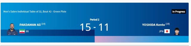 به گزارش ایسنا، در ادامه رقابتهای شمشیربازی سابر انفرادی المپیک ۲۰۲۴ پاریس، کاپیتان تیم ملی ایران موفق شد به مرحله یکهشتم نهایی صعود کند. علی پاکدامن در دور نخست استراحت داشت و سپس به مصاف یوشیدا از ژاپن رفت. کاپیتان تیم ملی برابر حریف ژاپنی با نتیجه ۱۵ بر ۱۱ پیروزی شد و به مرحله بعد رفت.
