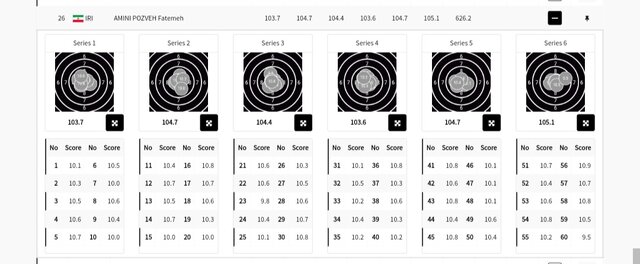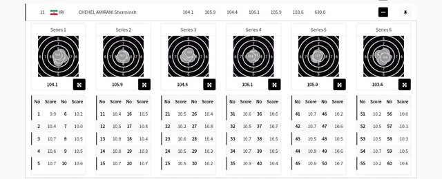 شرمینه چهل‌امیرانی با رکورد ۶۳۰ در رده یازدهم و فاطمه امینی با رکورد ۶۲۶.۲ در رده بیست و ششم ایستاده و از رسیدن به فینال این ماده بازماندند. در این ماده تیرانداز کره‌ای با رکورد ۶۳۴.۵ به عنوان نفر نخست و تیرانداز فرانسوی با رکورد ۶۳۱.۳ به عنوان نفر هشتم به فینال رسیدند.