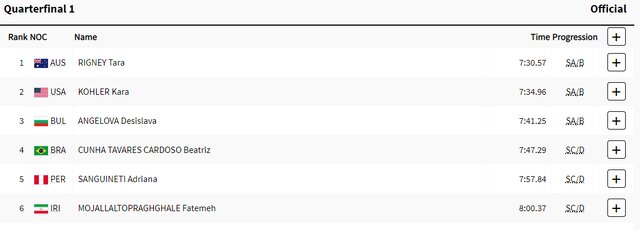 به گزارش ایسنا، در چهارمین روز بازیهای المپیک ۲۰۲۴ پاریس مرحله یکچهارم نهایی رویینگ یکنفره سنگینوزن زنان برگزار شد و نماینده ایران نتوانست به دور نیمهنهایی A و B صعود کند. فاطمه مجلل در این مرحله زمان هشت دقیقه و ۳۷ صدم ثانیه را ثبت کرد و به عنوان قایق ششم و آخر از خط پایان رد شد.