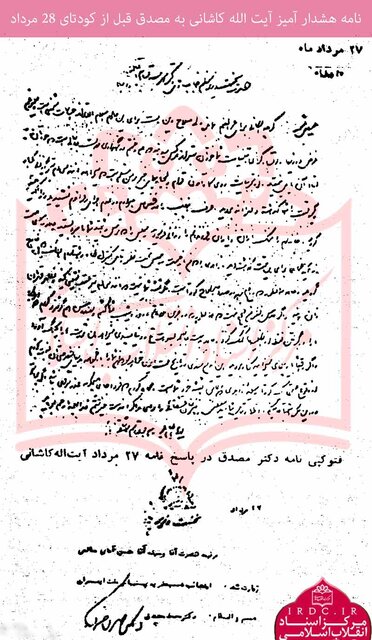 مشروح نامه آیتالله سید ابوالقاسم کاشانی به دکتر محمد مصدق که در تاریخ ۲۷ مرداد ۱۳۳۲، یک روز قبل از به اجرا درآمدن کودتای انگلیسی - آمریکایی ۲۸ مرداد ۱۳۳۲ صادر شد، به شرح زیر است: