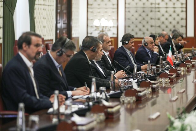 پزشکیان پس از مراسم استقبال رسمی به محل کاخ ریاست جمهوری رفت و با «عبداللطیف رشید» رئیس جمهور عراق دیدار کرد.