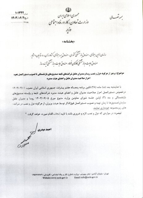 به گزارش ایسنا،‌ در متن بخشنامه احمد میدری آمده است: «با عنایت به بند (ث) ماده (۲۸) قانون برنامه پنج ساله هفتم پیشرفت جمهوری اسلامی ایران مصوب ۱۴۰۳/۰۳/۰۱ در خصوص دستور العمل احراز صلاحیت مدیران عامل و اعضای هیئت مدیره شرکت‌های تابعه و وابسته صندوق‌های بازنشستگی و بند ۳ اولین جلسه شورای معاونین وزارت متبوع مورخ ۱۴۰۳/۰۶/۰۵ روسا و مدیران عامل سازمان/ صندوق‌ها تا زمان تهیه و تصویب دستورالعمل فوق‌الذکر توسط هیئت وزیران، از هر گونه عزل و نصب در شرکت‌های زیر مجموعه خودداری کنند.