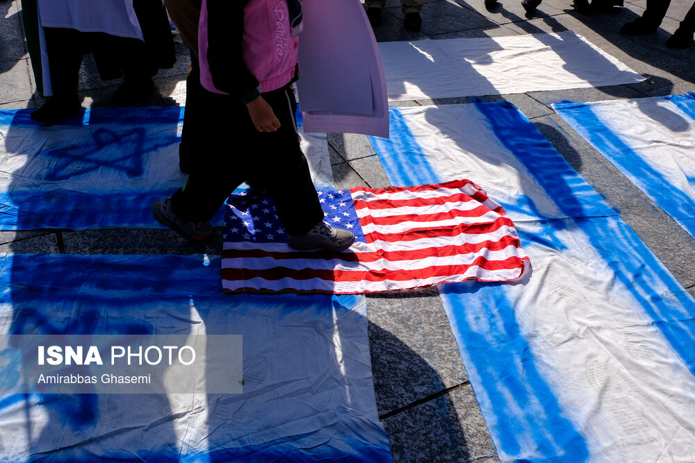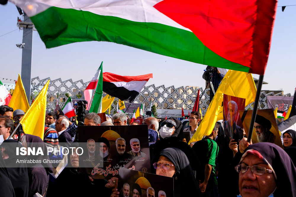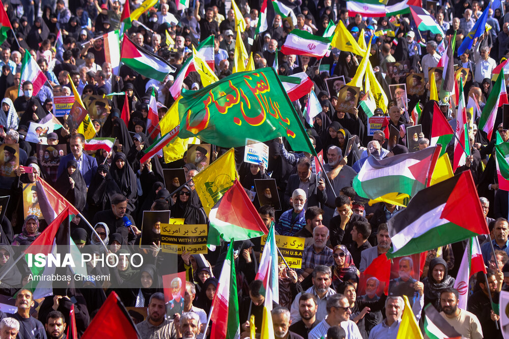تجمع کنندگان پرچم های ایران، فلسطین، حزبالله، سوریه و پلاکاردهای «مرگ بر آمریکا» و «مرگ بر اسراییل» را در دست داشتند.