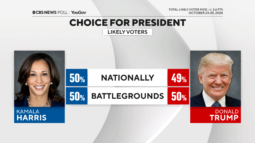 نظرسنجی سیبیاس نیوز در قسمت دیگری به مسئله حساس ایالتهای کلیدی میپردازد که در آن ترامپ و هریس کاملا برابر و از حمایت ۵۰ درصدی در این ایالتها برخوردار هستند. اما در سطح ملی ترامپ ۴۹ درصد و هریس با یک درصد اختلاف (۵۰ درصد) نسبت به رقیب جمهوریخواه خود پیشتاز است.