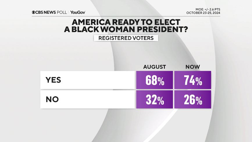 در قسمت دیگری از این نظرسنجی سوالی مطرح شده مبنی بر اینکه آیا آمریکا آماده پذیرش یک زن سیاهپوست به عنوان رئیسجمهور است یا خیر، که در ماه اوت ۶۸ درصد پاسخ بله و ۳۲ درصد خیر گفته بودند اما هم اکنون ۷۴ درصد پاسخ بله و ۲۶ درصد خیر را ثبت کردهاند.