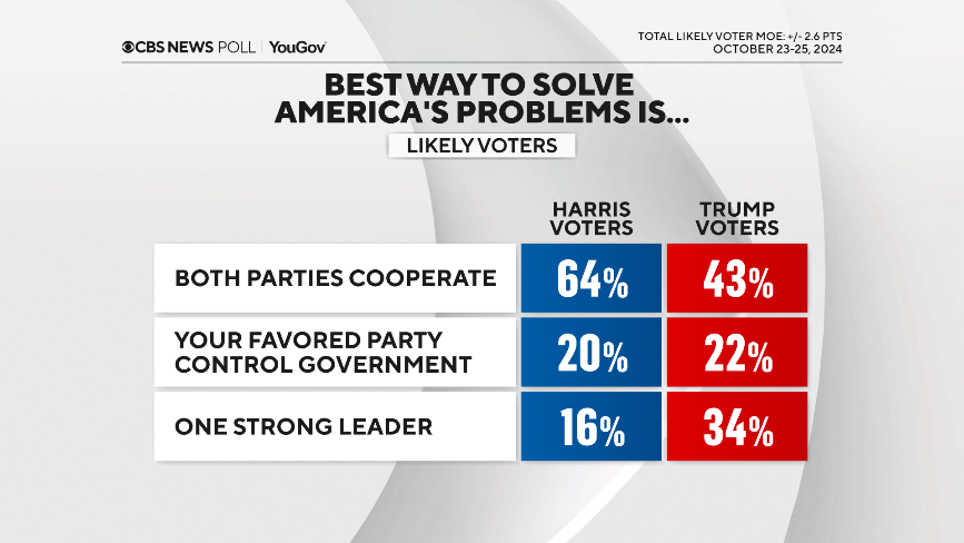 نظرسنجی سیبیاس نیوز/یوگاو که از میان ۲۱۶۱ بزرگسال در تاریخ ۲۳ الی ۲۵ اکتبر انجام شده است، در رابطه با حلوفصل مشکلات آمریکا نشان میدهد که ۶۴ درصد به هریس و ۴۳ درصد به ترامپ درباره اینکه هر ۲ حزب با هم همکاری خواهند داشت، رای دادهاند. اما ۲۰ درصد به هریس و ۲۲ درصد به ترامپ درخصوص اینکه فقط حزب مربوط به خودشان کنترل امور را به دست خواهد گرفت، رای داده و ۱۶ درصد به هریس و ۳۴ درصد به ترامپ درباره اینکه «یک رهبری قوی» بهترین راهحل برای مشکلات آمریکا خواهد بود، رای دادهاند.