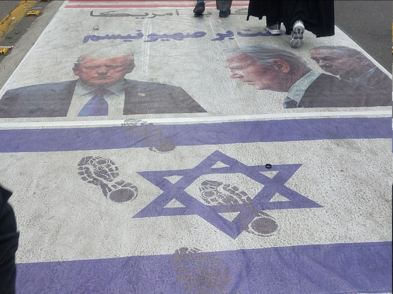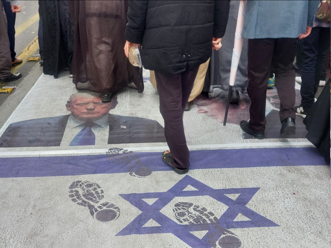 حاضران در این مراسم بر روی پرچمهای آمریکا و رژیم صهیونسیتی که روی زمین پهن شده بود عبور و راهپیمایی کردند.
