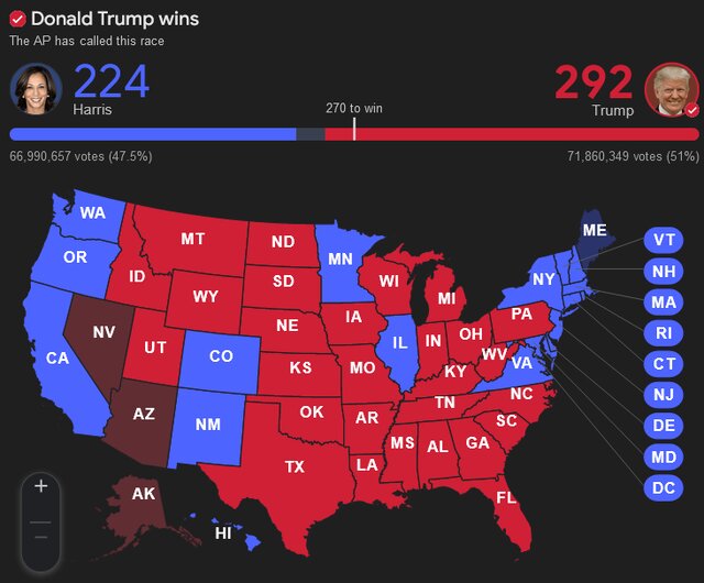 ترامپ تاکنون آرای ایالات زیر را به دست آورده که معادل ۲۹۲ رای الکترال است: