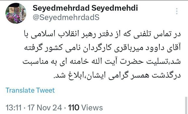 «در تماس تلفنی که از دفتر رهبر انقلاب اسلامی با آقای داوود میرباقری کارگردان نامی کشور گرفته شد، تسلیت حضرت آیت‌الله خامنه‌ای به مناسبت درگذشت همسر گرامی ایشان، ابلاغ شد.»