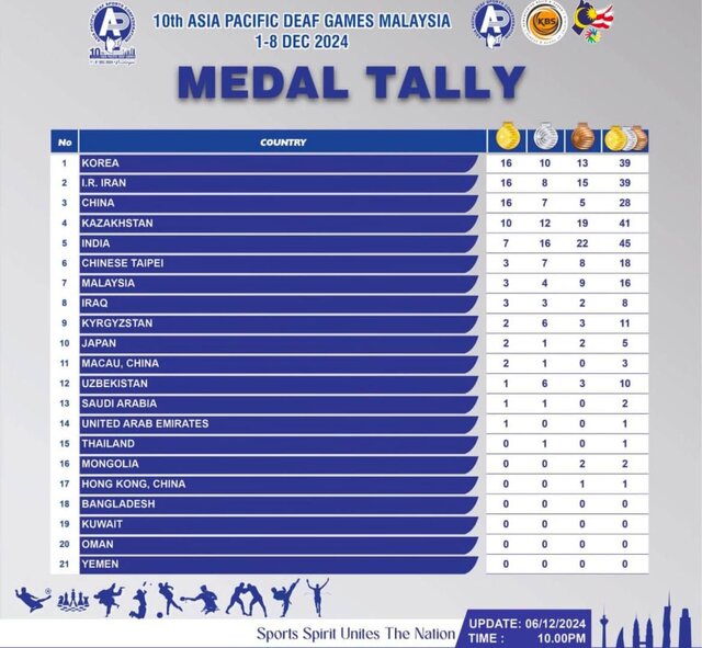 به گزارش ایسنا، دهمین دوره بازیهای آسیایی ناشنوایان در حالی فردا (یکشنبه ۱۸ آذر) به میزبانی مالزی پایان میرسد که سه کشور ایران، چین و کره با داشتن ۱۶ مدال طلا در جدول ردهبندی برای قهرمانی رقابت تنگاتنگی را دارند.