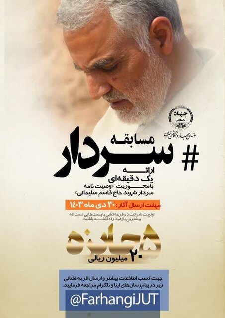 به گزارش ایسنا، مسابقه «#سردار» با موضوع ارائه یک دقیقهای با محوریت وصیتنامه سردار شهید حاج قاسم سلیمانی، ویژه دانشجویان خواهد بود. این رویداد با استفاده از قالبهای صدا و تصویر آزاد است.