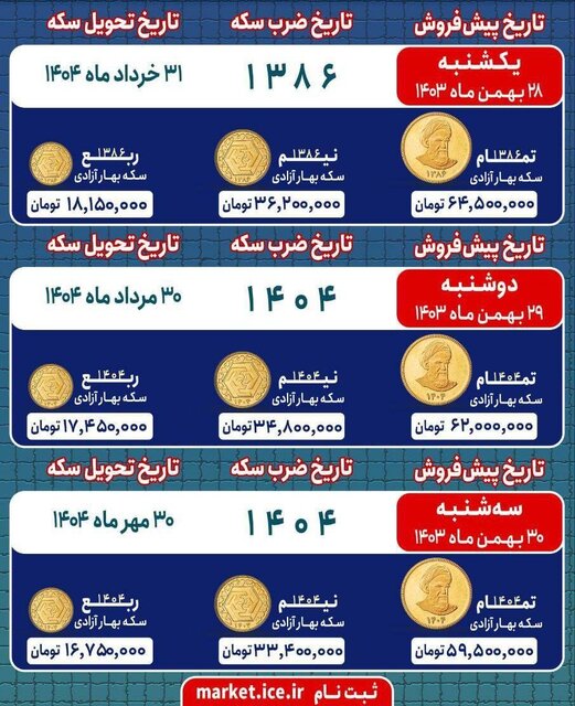 متقاضیان پیش‌فروش امروز برای خرید ربع سکه باید ۱۸ میلیون و ۱۵۰ هزار تومان، برای نیم سکه ۳۶ میلیون و ۲۰۰ هزار تومان و برای تمام سکه ۶۴ میلیون و ۵۰۰ هزار تومان پرداخت کنند.